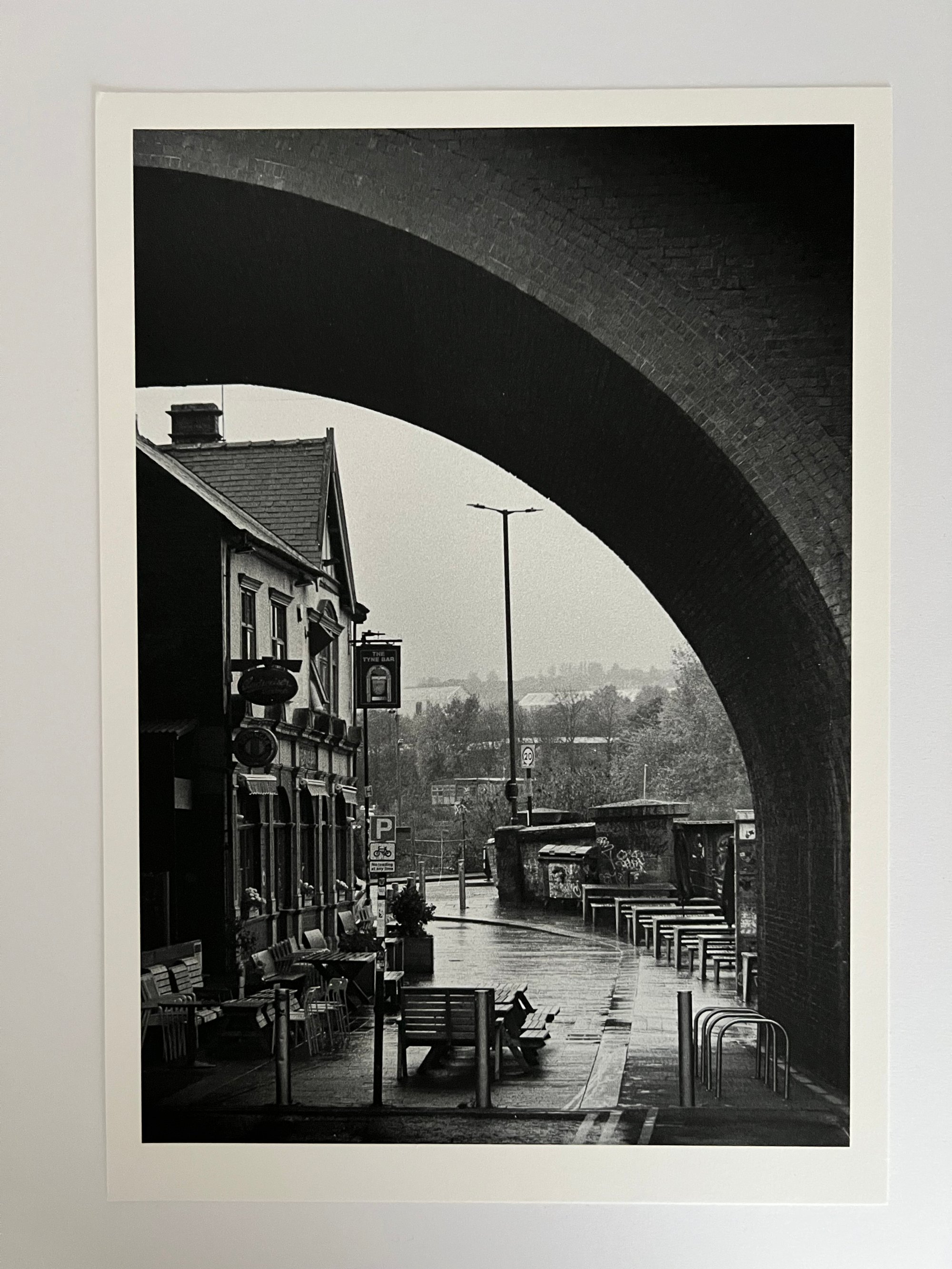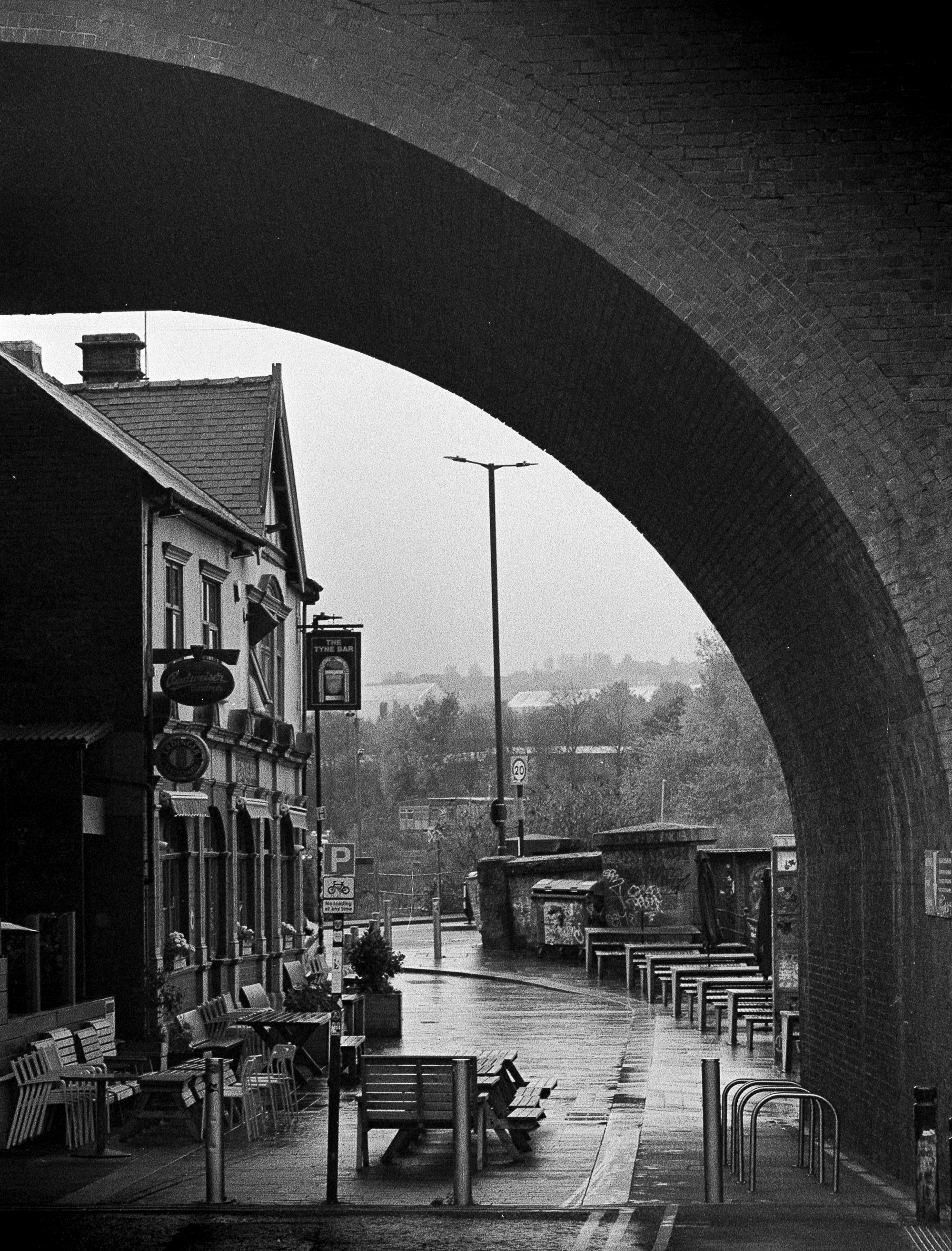 A black and white film scan of a picture taken on a damp January afternoon looking at The Tyne Bar. Shot on Ilford HP5 film, scanned and then printed on 312gsm fine art paper. Available in various options